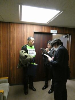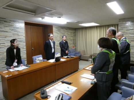 要請団は県庁を後にし、市町村会館を訪れました。富山県市長会事務局次長、町村会総務課長2名と懇談し、公的病院の赤字拡大と人件費へのしわ寄せについて、診療報酬改定のタイミングと中間改定の要請、地域医療存続の重要性と波及効果などについて話題に懇談を行いました。市長会は各市の要望を取りまとめ、国へ提言する役割を説明。