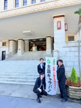 全国キャラバン6県目は、長野県。10月24日大栗陽(全厚労書記長)と花澤直樹(全厚労副執行委員長)、小林吟子(長厚労執行委員長)、高橋ただし(長厚労書記長)(以下、要請団)は、長野県健康福祉部医療政策課医師・看護人材確保対策課企画幹兼課長補佐医師係長と課長補佐、介護支援課課長補佐に要請内容を説明し、県側の支援施策と国への要望状況を共有しました。