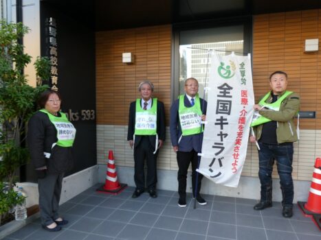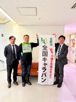 要請団は全国キャラバンの意義を説明したのち、地域医療支援の訴えや療現場の疲弊と経営悪化について人員不足と賃金状況の遅れなどから医師・看護師の絶対数不足と地域医療への影響について訴えました。