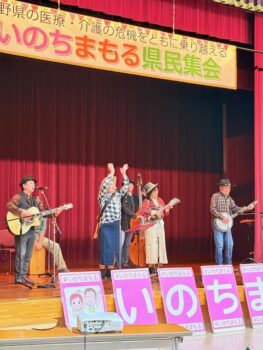 13時から文化行事、演奏楽団ミルク&カウボーイズの演奏から始まりました。医療関係者でつくる音楽グループで長厚労OBの方もいらっしゃいます。13時30分から長野県民主医療機関連合会会長の開催挨拶の後、長野県社会保障推進協議会事務局長の基調報告がありました。続いて、リレートークとして地元弁護士や村会議員、難病患者連絡協議会会長、障害者連絡協議会代表、福祉人材センター所長、介護福祉士会会長、長野県看護協会会長、保険医協会副会長、臨床研修医までさまざまな立場から発言がありました。
