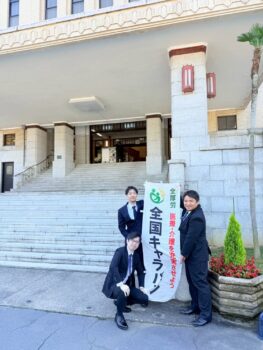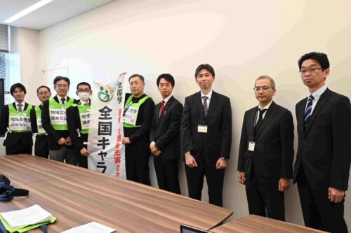 11月4日には全厚労中執による秋の厚労省交渉(2面詳報)を行った後、全国キャラバンは東海ブロックに入り、岐阜県へと向かいました。11月6日、岐厚労役員4名とともに、市長会・町村会との懇談を行った後、県庁に向かい要請。担当者へ、医療・介護人材流出の課題や医療機関の赤字状況等について訴え、スピード感ある支援措置を求めました。ここでもマスコミ2社から取材を受けました。