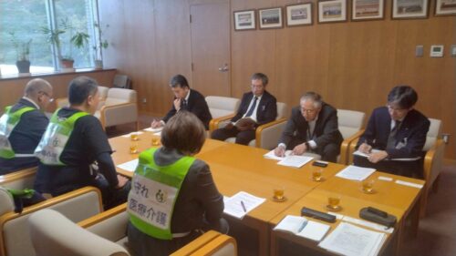 10月24日には隣県の長野県に向かい、長厚労役員3名とともに医師・看護師確保対策や介護支援に関わる課の課長補佐らと懇談しました。要請団からは医療が教育や買い物等の生活インフラであることや自治体の財政力と補助金の額によって病院の経営状況に格差が生じていることなど、構造的問題を訴えて全国知事会会長となった長野県知事の活躍に期待を表明しました。