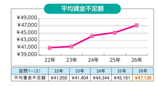 生活実感から月の賃金不足額の項目(下図)では、昨年4万5千円を超えましたが、今年はすでに4万7千円以上不足しているとの結果となっています。