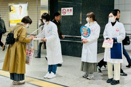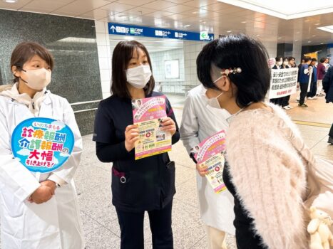 2日目は、60名が参加して、静岡駅北口地下通路にてメディカルウェーブを行いました。通路ということで、やや肌寒さはありましたが、2名1組になって、熱心に通行人に署名への協力を呼びかけました。また各県ののぼりやチラシ等を持って配るなどの役割分担でアピールしました。各県の執行委員長のリレートークで、それぞれの病院の現況や待遇改善などを訴えました。