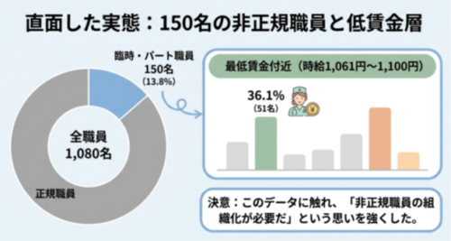 非正規職員の実態を調べてみると、その多くが「最低賃金」近傍の時給で働いていることが分かり、「非正規の組織化が必要だ」という思いを改めて強くしました(図①)。