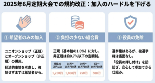 その後、25年6月の定期大会で規約改正を行い、非正規職員については、希望者のみ加入でき、組合費は0.7%以下の定額制、労組役員は免除などの負担軽減措置(図②)を取りました。また組合勧誘の際にも、「具体的なメリット」(図③)を打ち出しました。