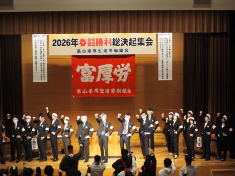 富厚労は4月4日に2026年春闘勝利総決起集会を参加者215名のもと開催し、各議決案、春闘スローガン、